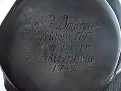 There are many pieces preserved cast by members of the Meyer family, documented or signed. Signatures have sometimes led to confusion since given names, as per common practice at the time, were repeatedly used in the family. Over six generations, seven Gerhardt (Gärdt, Gerdt, Gert, Gertts, Gerhard) and eight Johann (Hans) are known. Sometimes these have been mixed up in the literature.[5]