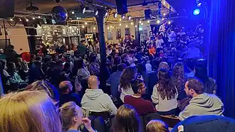 The Mezrab was founded by storyteller and musician Sahand Sahebdivani in 2004. As an Iranian refugee he wanted to continue his parents' tradition of Iranian music and storytelling.[6] It started as a gathering in the family's living room and grew into a monthly storytelling evening in a small tea house.[7] Through the years the gatherings became more frequent and the Mezrab moved to various locations to keep up with its growth.[8] In 2014, a crowdfunding was organized to move to the former location of music cafe Pakhuis Wilhelmina at the Veemkade,[9] which has since become the fixed location for the center. In that same year the Mezrab Storytelling School was founded by Farnoosh Farnia and Raphael Rodan, and the team was expanded with Rogier Lammers as the music programmer and Karl Giesriegl as the creative director.[10] Since then the Mezrab has a cultural program of over 300 events per year,[4] with in addition to storytelling, music concerts, open mic evenings, dance, theatre and comedy. As most of its programming is in English, the center has become a popular destination for the international community of Amsterdam.[11]