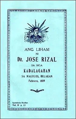 After the first issue of La Solidaridad was published, the writer Marcelo H. del Pilar, who himself was from the province of Bulacan, sent a letter to José Rizal, suggesting that he read the article of López Jaena. Del Pilar urged Rizal to write a letter in Tagalog to "las muchachas de Malolos," adding that it would be "a help for our champions [campoenes] there and in Manila."[30][36] At the time, Rizal was well known in the Philippines for his anti-clerical 1887 novel Noli Me Tángere.[37] In his reply to Del Pilar, Rizal shared the handwritten manuscript of the letter he wrote to "las malolesas."[38]