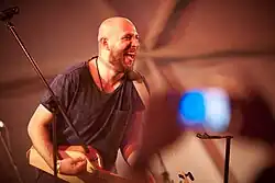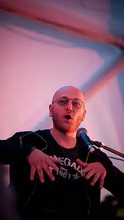 ![]() Gigi Dedalamazishvili from Mgzavrebi performing at DOT rooftop in Saint Petersburg in July 2017 | |