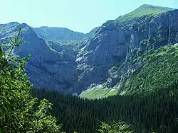 The boundaries of Miętusia Valley are defined by three arêtes: the northwest arête of Ciemniak, the main Tatra arête from Ciemniak to Małołączniak, and the northwest arête of Małołączniak, running through Czerwony Gronik to Kończysta Turnia.[3] The lower part of the valley runs roughly east-west and is a typical river valley. At the lower end of Niżnia Miętusia Rówień, the valley shifts to a southeast direction, and its character changes due to glacial shaping. The valley features three distinct levels separated by rocky knickpoints:[1]