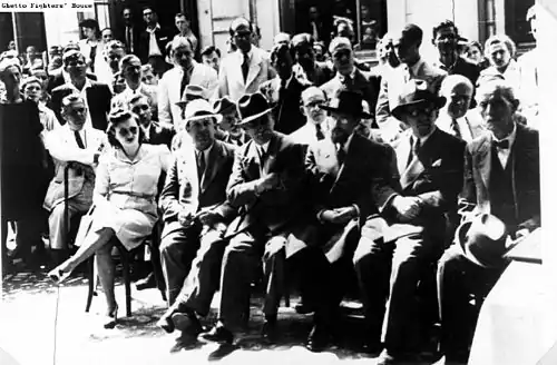 Zissu reports that, in the resulting panic following the arrests, Renașterea wanted Benvenisti stripped of any decision-making powers, for which reason Zissu himself was made president of a new, but unrecognized, Zionist Executive.[121] This is partly contradicted by Benvenisti's account, which notes that he willingly resigned "by the end of 1943, or by the start of 1944", or "not long after my liberation".[122] He took this decision when a group of Romanian and Palestinian Zionists (including Zissu, Entzer, Barlas and Moritz Geiger) expressed their wish to defy the British caps on immigration by fitting illegal transports of Jews.[123] From the moment of his release to April 1946, Benvenisti was largely absent from the Zionist Executive—though he accepted invitations to attend meetings chaired by Zissu, and spoke there on several occasions.[124] He was instead elected chairman of a more centrist political party, the Zionist Democratic Group Klal, which had also rejected Zissu's policies.[125]
