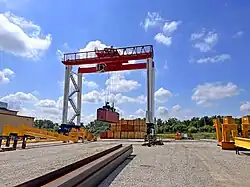 The Mi-Jack Travelift is a rubber tired gantry crane used for a variety of applications, from steel and precast concrete, to manufacturing, wind, or bridge related lifting needs.[2]