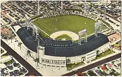 The Miami Amigos played home games at Miami Stadium. The ballpark had a capacity of 9,548 (1992) and dimensions of (Left, Center, Right): 330–400–330 (1950).[16] Miami Stadium was built in 1949. It had a cantilevered grandstand with no support beams. A high, rounded roof, with palm trees growing out of the paved walkway circled the stadium. The stadium was renamed "Bobby Maduro Miami Stadium" in 1987. It was torn down in 2001. The stadium was located at 2301 Northwest 10th Avenue, Miami, Florida.[17][3]