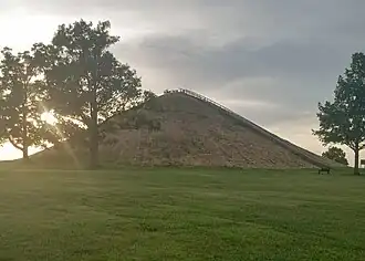 Miamisburg Mound is a conical Native American Mound in Miamisburg, Ohio. At 65 feet (20 m) tall and 800 feet (240 m) in circumference, it is the largest burial mound in the Eastern United States. Built atop a hill overlooking the Miami River, it is believed to have been built by the Adena Culture between 800BC and 100AD.[2] An excavation in 1869 unearthed several skeletons surrounded by clay and charcoal and a collection of ceremonial goods, including pipes and animal effigies.[3] Charles F. Kettering bought the mound and turned it into a park in 1920. It was turned over to the Ohio Historical Society for preservation in 1929. The site is managed locally by the city of Miamisburg. Stairs have been built allowing access to the top of the mound and providing impressive views of the Dayton area.[2][4] Mound Laboratories, originally part of the Manhattan Project, is located across the street and was named for the Miamisburg Mound.[5]