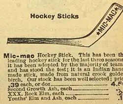 In 1863, the Starr Manufacturing Company in Dartmouth, Nova Scotia, began to sell the Mic-Mac Hockey Stick nationally and internationally.[6] Hockey became a popular sport in Canada in the 1890s,[7] and through the first decade of the 20th century, the Mic-Mac was the best-selling hockey stick in Canada. By 1903, apart from farming, producing them was the primary occupation of the Mi'kmaq on reserves throughout Nova Scotia, particularly Shubenacadie, Indian Brook and Millbrook.[6] In 1927 the department of Indian Affairs for Nova Scotia noted that the Mi'kmaq remained the "experts" at making hockey sticks.[8] Mi'kmaq continued to make hockey sticks until the 1930s, when the product was industrialized.[9][10]