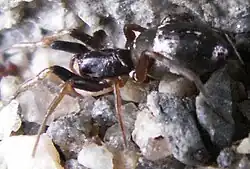 Micaria pulicaria is found at ground level in a wide variety of habitats, although showing a marked preference for sandy sites.[6] The preferred habitat has scattered stones or small beds of stones. In Great Britain it has been recorded from the warm, sunny parts of sandy heaths, chalk downlands, dunes and derelict land, but it has also been found in saltmarsh, sphagnum filled dune slacks, mossy areas in broad-leaved woodland as well as the expected stony, bare, dry habitats.[5]