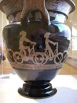 In the early 1960s, Frimkess went to Berkeley, California where Peter Voulkos was then teaching at the University of California, Berkeley. While there, he studied bronze and aluminum casting with Voulkos.[2] In 1963, his piece "Hooker No. 1" (a bronze sculpture of a television) was displayed at the San Francisco Art Institute's Annual exhibition at the San Francisco Museum of Modern Art.[9] Also that year at the behest of Voulkos, Frimkess took an internship at the Clay Art Center in Port Chester, New York. It was there that he met his future wife and frequent collaborator, Magdalena Suarez, who had come to the Art Center from Venezuela as part of a fellowship program.[2] While on the east coast, Frimkess was instructed to visit museums in New York City and Boston to study Greek and Chinese forms of pottery. He also began learning the technique of "dry throwing" clay rather than using water.[6][10] Much of his work after 1965 replicated classical forms like Greek volute kraters, Zuni pots, and Chinese ginger jars.[3][11]