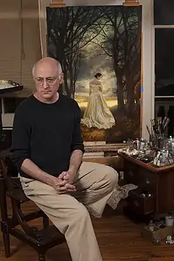 ![]() Michael Deas in front of his painting, The Memory of Things Done and Said (oil on panel, 49.5 x 34.5", 2015–2017), photographed by Thom Bennett | |