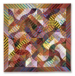 As James's work progressed through the mid to late 1980s, the grid-based composition of his designs became increasingly disguised.[43] He strove to eliminate the traditional quilt block construction method from his work completely, as he felt that it was becoming "too predictable." By 1988, his quilts were still designed upon a gridded foundation, but the construction of the quilt tops no longer relied on square blocks.[44] Between 1986 and 1989, he experimented with the overall silhouette of the quilt, breaking out of the standard, rectangular format.[45] His work was described by newspapers and magazine articles of the time as "spacially complex," "airy",[35] and "full of light and movement."[46]