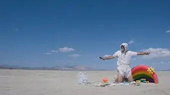 Baby Ikki has appeared internationally in performances, videos and installations in New York (Electronic Arts Intermix, MoMA), Los Angeles and Europe.[15][47][46][48][30] He was featured in a collaborative exhibition with Seth Price, "Playground" (2003, Galleria Emi Fontana, Milan), that included an installation of playground toys and video projections depicting him visiting various deserted meeting places.[30][46] In 2009, Smith collaborated with artist Mike Kelley on a multimedia installation based on Baby Ikki’s adventures at Burning Man, A Voyage of Growth and Discovery (SculptureCenter, 2009; West of Rome, 2010).[12][46] The project combined aspects of both artists' past work—dancing, dressing up, infantilism—with the festival's ethos of weeklong "radical self-expression."[46] It included an eighteen-foot Baby Ikki junk sculpture and skeletal metal playground structures designed by Kelley and projected video of Ikki at the festival, playing tetherball, dancing, and interacting amid the mass of people.[47][46]