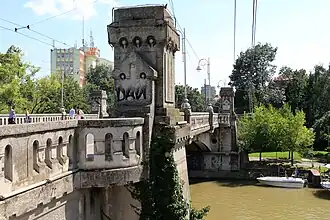 Michael the Brave Bridge (Romanian: Podul Mihai Viteazul), formerly Andrei Șaguna Bridge and Bishop's Bridge, is located in the western Romanian city of Timișoara. It crosses the Bega and connects the Cetate district with the Elisabetin district. It carries private motorized traffic and trolleybuses. The bridge is ten meters wide, and two and a half meters wide for pedestrians.[1] On the sides, at the ends, stairs descend on either side to the Bega Canal cliff.