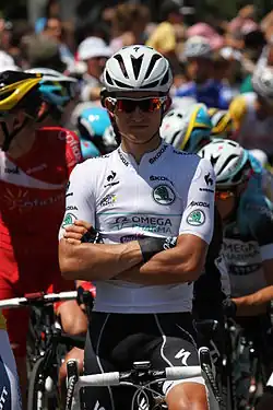Kwiatkowski's excellent form saw him selected to ride the Tour de France. He wore the white jersey – of young rider classification leader – in the first week after coming third on Stage 2 and fourth on Stage 3, both reduced bunch sprints. On Stage 7 he came in fourth again. On Stage 9 (a high mountain stage) he reached the podium once again. With a strong time trial, he was able to regain the white jersey of the young rider classification on Stage 11, but lost the lead shortly after to Nairo Quintana.[7] Even though he lost the white jersey, he still finished 11th in his Tour debut.[8]