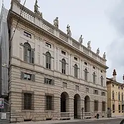 • Portal of the Palazzo del Capitanio in Piazza dei Signori. Commissioned by Captain Leonardo Giustinian and built presumably between 1531 and 1533, the white stone portal echoes the theme of the triumphal arch and is characterized by the use of the Corinthian order and the presence of noble coats of arms.[56]