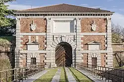 • Porta San Zeno. Probably built between 1540 and 1541 and certainly finished in 1542 (date given in an inscription located on the city-side facade), it has several original elements compared to the other two city gates, starting with the facade made not entirely of stone, but with alternating bricks, and a greater simplicity and sobriety. This is probably due to the need to build it in a short time and at a relatively modest expense.[43][44]