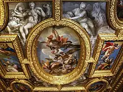 The ceiling decorated by Paolo Veronese in the Hall of the Council of Ten at the Doge's Palace in Venice, a commission also obtained with the support of Sanmicheli