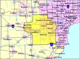 The district includes portions of Detroit and some of its suburbs, and from 2013-2023, was the only congressional district in Michigan to be contained within a single county.[3] District boundaries were redrawn in 1993, 2003, 2013, and 2023 due to reapportionment following each respective census.