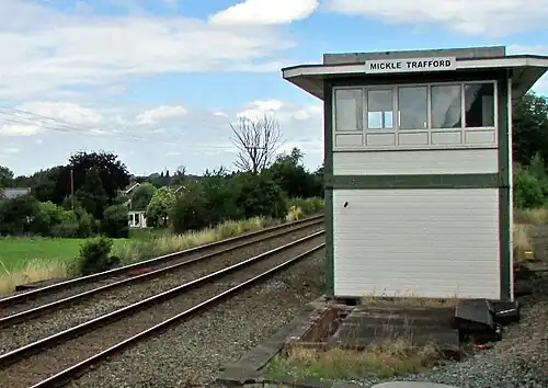 ![]() Mickle Trafford signal box in 2013 showing also the line from Chester to Warrington | |||||