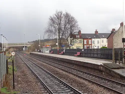 The station was originally opened by the Leeds and Selby Railway in 1834, though buildings were not erected (on the north side) until the following year. The line towards Church Fenton was added by the North Eastern Railway in 1869 and four years later the first of two rounds of improvements to the station were initiated, with the rebuilding of the 1835 station house. Even after this was completed, there were complaints leveled at the NER by local travellers over the facilities on offer and so in 1879, the contract for a completely new station was placed.[1] This included new platforms, footbridge and a booking office on the westbound platform, along with access from the original A1 Great North Road (since bypassed - the present A1 crosses the railway to the east, near the junction of the two lines). The buildings and bridge were demolished in the 1970s (though the older station house still stands) and there are now only basic waiting shelters on each (staggered) platform.