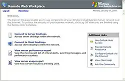 The Remote Web Workplace is a feature of Microsoft's Windows Small Business Server, Windows Home Server 2011, and the midsize business-focused product, Windows Essential Business Server, which enables existing users to log into a front-end network-facing interface of the small business/home server.