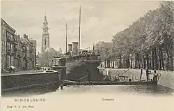 Middelburg profited from the railway connection, the Port of Vlissingen and the Canal through Walcheren, but did not recover her former glory as a commercial center. In 1878 41 ocean-going ships arrived in Middelburg. The dry dock was used by 31 ships.[49] In 1880 only 29 sea-going ships arrived, and only 16 vessels used the dry dock. In 1882 25 ships used the dry dock, amongst them the steamer Nederland of 95 m. in 1884 17 ships used the dry dock for 168 days. In 1885 37 sea-going ships arrived, and 24 ships used the dry dock.[50] In 1890 33 ships used the dry dock. In 1891 30 ships used the dry dock for 117 days. Amongst these SS Prinses Amalia of the Netherland Line of 114 m.[51] In 1892 the dry dock was used by 28 ships. As these numbers show, the harbor of Middelburg was not busy enough to generate enough traffic for the dry dock.