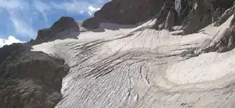 Middle Teton Glacier is on the northeast flank of Middle Teton in Grand Teton National Park, Wyoming.[2] The alpine glacier is a popular mountaineering route for ice climbing and for access to the summit of Middle Teton and other peaks to the south. The glacier is at the west end of Garnet Canyon, which is the most popular route used by climbers ascending Grand Teton. The glacier melt feeds streams below including Spalding Falls, an 80 ft (24 m) high cascade. Between 1967 and 2006, Middle Teton Glacier lost approximately 25 percent of its surface area, shrinking from 52 to 39 acres (21 to 16 ha).[3]