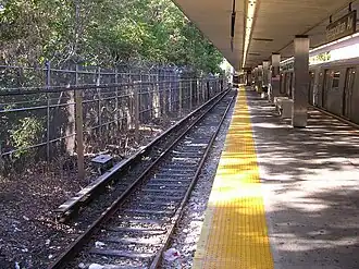 The station, built on an embankment with the north end at street level,[2][5] has two tracks and a concrete island platform with benches. The tracks end at bumper blocks at the north end of the platform. A steel canopy with fluorescent lights and supported by silver columns covers the entire platform.
