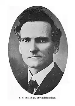 One of Middlesboro's most distinguished school superintendents was Dr. James Wood (J.W.) Bradner. A graduate of Tri-State College (BS); Indiana University (AB); Columbia University (MA); and graduate studies at Chicago University, Dr. Bradner was a nationally respected educator and administrator. Under his leadership at Middlesboro beginning in the fall of 1921, the school system was considered the top district in the state. The distinguished Bradner was selected by the Governor of Kentucky to head the Kentucky Department of Education. Dr. Bradner served the school system and community until his sudden death in 1944. As a result of Bradner's devotion and service to Middlesborough public schools, the football stadium located in downtown is named in his honor.