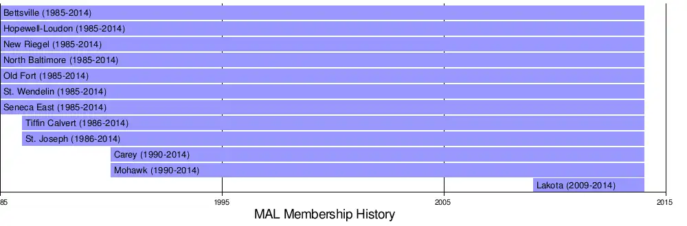 • The MAL was created for the 1985-86 school year's basketball season with Bettsville, Hopewell-Loudon, New Riegel, Old Fort and Seneca East coming from the crumbling Seneca County League to combine with North Baltimore and St. Wendelin from the former Lakeshore Conference. Hopewell-Loudon and Seneca East were also full members of the Lakeshore Conference. Tiffin Calvert and St. Joseph agreed to join the league, but were not able to leave the Sandusky Bay Conference until the 1985-86 school year ended.