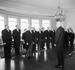 ![]() Miettunen's government, which had been fired April 13, at President Urho Kekkonen's home, Tamminiemi. PM Martti Miettunen speaks | |