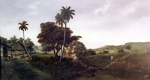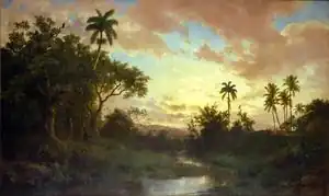 Miguel Arias Bardou (1841–1915) was a Spanish born Cuban painter. He is best remembered for colorful landscapes such as Pueblo Campesino (1891) and Bohío y Palma con Riachuelo (1908) which mainly depicted harmonious rural themes.