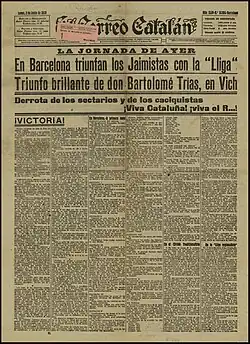In 1908–1909 Solidaritat was gradually disintegrating as parties forming the alliance were pursuing increasingly incompatible goals.[63] The Carlists were more and more anxious about partnership with parties suspected of separatism; Junyent for some time tried to alleviate the charges, e.g. by declaring that for local Traditionalists Catalonia was a sister province to all other provinces, and Spain was their common mother.[64] However, in 1909 also he developed grave doubts; El Correo was increasingly engaged in polemics with Catalan nationalists[65] and some Junyent's editorials assumed belligerent tone, lambasting "cobardes y canallas".[66] By next general elections of 1910 Solidaritat was already defunct; Junyent managed to negotiate merely a local alliance with La Lliga, and as a joint carlista-liguero candidate he tried to renew his Cortes bid from Vic.[67] This time he lost marginally to a Liberal candidate;[68] his protests pointing to alleged corruption proved ineffective.[69]