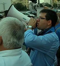 In the 2012 parliamentary election on 9 December, he ran as an ARD candidate for the Chamber of Deputies in Arad County,[33] securing, with 30.2 percent of the vote, second place in the county's first district, failing to be elected. The ARD was affiliated with the European Conservatives and Reformists Group.[34] In March 2014, Neamțu along with philosopher Gabriel Liiceanu took part in a rally against the television stations owned by politician and businessman Dan Voiculescu following critical comments by Antena 3 hosts Mihai Gâdea and Mugur Ciuvică against writer Andrei Pleșu.[35] Neamțu ran unsuccessfully as ARD's lead candidate for the 2014 European Parliament election in Romania on 25 May.[36][37] On 16 March 2015, Neamțu resigned as chairman of the ARD, citing that soon become a farther among other reasons.[38] After this, he held a break from public life.[3]