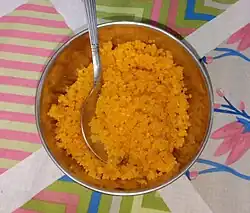 Mihidana (Bengali: মিহিদানা) is an Indian sweet from Burdwan, West Bengal, India.[1] Mihidana, described as the micro cousin of the traditional Boondi, is derived from two words, Mihi meaning fine, and Dana, meaning grain.