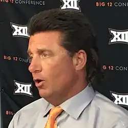Michael Ray Gundy (born August 12, 1967) is an American college football coach and former player. He is the head football coach at Oklahoma State University. Gundy played college football at Oklahoma State, where he played quarterback from 1986 to 1989. He became Oklahoma State's coach on January 3, 2005. Gundy and the University of Utah's Kyle Whittingham are currently the second-longest tenured FBS coaches with one school, trailing only Kirk Ferentz. Gundy and Whittingham are the longest-tenured in the Big 12 Conference.