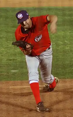 ![]() Hinckley pitching for the Oklahoma City RedHawks, Triple-A affiliates of the Texas Rangers, in 2009. | |