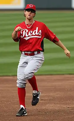 In 2010, Leake competed for the Reds' fifth starter spot and ultimately won a spot on the Reds' twenty-five man roster amid competition from veterans Mike Lincoln, Justin Lehr, and Micah Owings and young pitchers Travis Wood and Aroldis Chapman.[6] Leake's contract was purchased on April 11, 2010. To make room for him, the Reds optioned Juan Francisco to the Louisville Bats, the Reds' Triple-A affiliate. They also designated Pedro Viola for assignment.[7] Leake became the first player since Xavier Nady, when he was with the San Diego Padres in 2000, to go directly from the draft to the major leagues,[8] and was the first starting pitcher to accomplish the feat since left-hander Jim Abbott of the California Angels in 1989.[9] He also was the first Cincinnati Red to do so since the abolition of the Bonus Rule after the 1965 season (shortstop Bobby Henrich, pitcher Jay Hook, and catcher Don Pavletich, who did so in 1957, all were "Bonus Babies").[8]