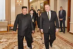 In September 2017, Pompeo sought authority for the CIA to make covert drone strikes without the Pentagon's involvement, including inside Afghanistan.[62] During Easter weekend 2018, Pompeo visited North Korea and met with Supreme Leader Kim Jong-un to discuss the upcoming 2018 North Korea–United States summit between Kim and Trump.[63]