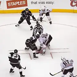 Richards and Flyers prospect Rob Bordson were traded to the Los Angeles Kings on June 23, 2011. In return, the Flyers received Wayne Simmonds, Brayden Schenn, and Los Angeles' 2012 second-round draft pick.[22][23] Richards reacted to the major deal by saying, "I was very shocked. At first I was shocked and then excited – I’m excited to move out to L.A. and be a part of a team that has a ton of great players. I’m just looking forward to helping them out."[24] A Dan Gross article suggested that Richards' "hard-partying ways" influenced the Flyers' decision to trade Richards. However, Flyers general manager Paul Holmgren stated that it was "preposterous" that partying had anything to do with the trade.[25] Jeff Carter was also traded, being sent to the Columbus Blue Jackets. Richards and Carter were reportedly traded due to their long contracts and to clear up cap space for Ilya Bryzgalov.[26] On October 15, Richards returned to Philadelphia and received a standing ovation from the crowd. He would assist on the winning goal, as the Kings won the game 3–2. Richards suffered a concussion and missed eight games during the season. He was later reunited with Carter on February 23, 2012, upon Carter's trade to the Kings from the Columbus Blue Jackets. On May 3, 2012, during game 3 of the Western Conference semifinals, Richards recorded his first career Gordie Howe hat trick when he got into a fight with Jamie Langenbrunner of the St. Louis Blues at 14:00 of the first period, scored a goal at 9:31 of the second, and recorded an assist at 11:48 of the third. On June 11, Richards won the Stanley Cup with the Kings, recording four goals and 11 assists in 20 playoff games. The following campaign, he recorded 32 points in the lockout-shortened 2012–13 season as the Kings would fail in their bid to repeat as Cup champions, losing to the eventual champion Chicago Blackhawks in the 2013 playoffs.