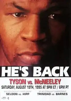 Mike Tyson vs. Peter McNeeley, billed as He's Back, was a professional boxing match contested on August 19, 1995.[1] The match marked the return of Mike Tyson to professional boxing after over four years away due to his 1991 arrest and subsequent conviction for rape in 1992 which led to Tyson serving three years in prison.