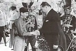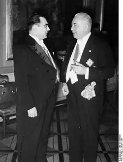 In 1938, Germany was planning to attack Czechoslovakia and Mussolini, in a bid to assist Hitler, worked to detach Yugoslavia from the Little Entente.[43] In June 1938, Stojadinović met with Count Ciano and promised him that Yugoslavia would do nothing if Germany attacked Czechoslovakia.[43] In return, Stojadinović asked that the Italians use their influence with the Hungarians to keep Hungary from attacking Czechoslovakia, saying the Little Entente was directed against Hungary, and as long as Hungary remained neutral, so would Yugoslavia.[43] After the Munich Agreement, Stojadinović appeared quite comfortable with the idea of Germany as the hegemonic power in Eastern Europe, and German-Yugoslav relations had improved so much that in late 1938, Stojadinović began talks about buying weapons from Germany for Yugoslavia.[44] Stojadinović started to call himself vodja, Serbo-Croatian for "leader", but stopped doing so because its resemblance to the Serbo-Croatian word for "devil," djavo, led his opponents to mock JRZ supporters for hailing the "devil".[45] Furthermore, Stojadinović's use of the title "the leader" led the Prince Regent Paul to doubt his loyalty to King Peter II.[45]