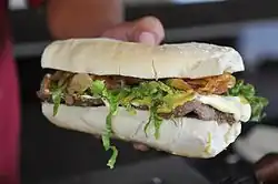 So big is the popularity of these sandwiches in San Miguel de Tucumán, that a monument to this food was built in 2013, by local artist Sandro Pereira.[2] Sandwicherías have been the main competitors to foreign fast food chains such as McDonald's, Burger King or Subway in Tucumán, with some of them selling as much as 500 sandwiches per night.[3] There is also an annual "Expo Milanga", which is celebrated every 18 March, commemorating the death of José "Chacho" Leguizamón, founder of one of the most traditional sandwicherías in the city.[4]