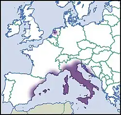 Milax nigricans is often abundant around the Mediterranean, especially in disturbed habitats: North Africa, Malta, Sicily, mainland Italy, Croatia, Sardinia, Corsica, southern France, Balearic Islands, northern and eastern mainland Spain, Canary Islands. In addition, local populations have been introduced further north in Europe and may persist: southern England (one record only), Munich, northern France, the Netherlands, Hungary. Other records based only on external appearance are liable to be the more widely distributed M. gagates and should be considered unreliable. There are indications of the long-distance dispersal of M. nigricans on both fresh produce and potted garden plants.[5][6]