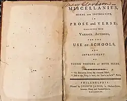 Moore herself was a poet as well as an appreciator of other writers' verse. Her own poems, together with verse by other writers, aphorisms, and proverbs—some of it culled from her commonplace book—were published in a textbook that she edited for young readers in 1787 entitled Miscellanies, Moral and Instructive, in Prose and Verse; Collected from Various Authors, for the Use of Schools, and Improvement of Young Persons of Both Sexes.[12] The phrase "moral and instructive" gives a clear idea of the nature of her own poetry.[6] Endorsed by Benjamin Franklin in a brief statement in the book's front matter, Moore's book was used in Philadelphia-area schools until well into the 19th century.[13] Earnings from the book's sales went towards a school for indigent girls that Moore founded in Montgomery County, Pennsylvania, and Moore herself taught there for the rest of her life.[10][14] Upon her death in 1829, she left the school an endowment.[14]