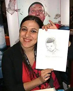 Italian artist Sara Pichelli, who designed Morales, holding a sketch of him at the 2011 New York Comic Con.