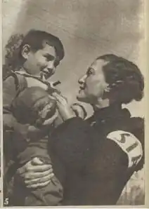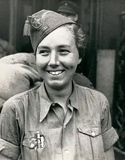Most women on the front served in militias aligned with some political group. A very small number served as members of the regular Republican army. Members included Esperanza Rodríguez.[2] In the first few months of the war, the Fifth Regiment had the largest contingent of milicianas among all militias.[6] Most of the women serving in front line roles had their positions defined by the communist, anarchist or POUM leadership. Most of these gave women equal roles when it came to combat, and providing the same military contribution.[2] In comparison to men, women on the front were often more expected to take care of injured comrades. This sometimes put them in more harms way, as some women militia members were shot while tending to injured comrades in battle. Women who had to deal with this situation included Josefa Rionda. Captains might also divert women on the battlefield to hospitals, where they expected them to work alongside nurses.[2] In some cases, milicianas were told by column leaders that they were only allowed to remain on the front in support roles for men, by doing working as nurses or teaching largely illiterate militiamen to read. A number of these women left those columns, seeking other units where they could serve in combat.[6] Among the women serving in the international brigades, most worked as nurses, pharmacists or doctors. Some Jewish, Polish and American women did go to Spain, and did serve in combat. They were actively discouraged from doing so by anarchists, and outright banned from doing so by communists.[29]