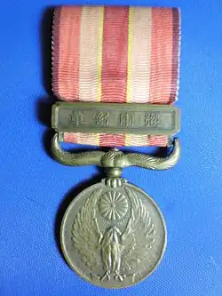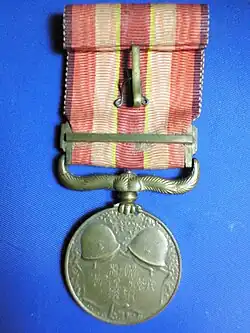 The China Incident Medal (支那事変従軍記章, Sina jihen jūgun kishō) medal was created by Imperial Edit No. 496 on July 27, 1939;[10] and was awarded for service in China at any time from the 12th through the 20th years of the Shōwa period -- Shōwa 12-20 (1937–1945).[11] An amendment was promulgated by Imperial Edict No. 418 in 1944; and the decoration was abolished in 1946 by government ordinance No. 177.[10]