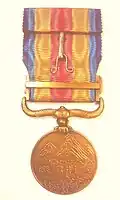 The Great East Asia War Medal (大東亜戦争従軍記章, Daitōa sensō jūgun kishō) was created on June 21, 1944 by Imperial Edict No. 417.[12] Because of the late date in the war it appears none were actually awarded to veterans. However many later replicas exist.[13]