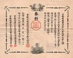 - "A medal of honor (jūgun kishō) is hereby given, on March 30, 1906, to Ernesto Burzagli, Lieutenant of the Italian Navy, on application by the Naval Minister of Japan and with the Emperor's approval, pursuant to the Regulation Relating to the Medals Honoring Participation in Battles (1904-05). Dated April 1, 1906."