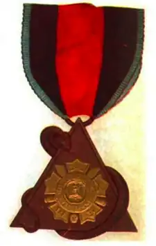 Initially, the MOS had two degrees, Khattee Puna (first degree), and the Bayana (second degree).[1] Subsequently, there were three degrees, the Khatee Puna (first degree), Kaul (second degree), and Bayani (third degree).[10][5] The badge of the Order (Khatapunan and Kaul degree badges) was a Filipino cross with the emblems of the American Service deposed on its arms; center and spaces between the arms of cross bear the symbols of the Katipunan.[3][5]
